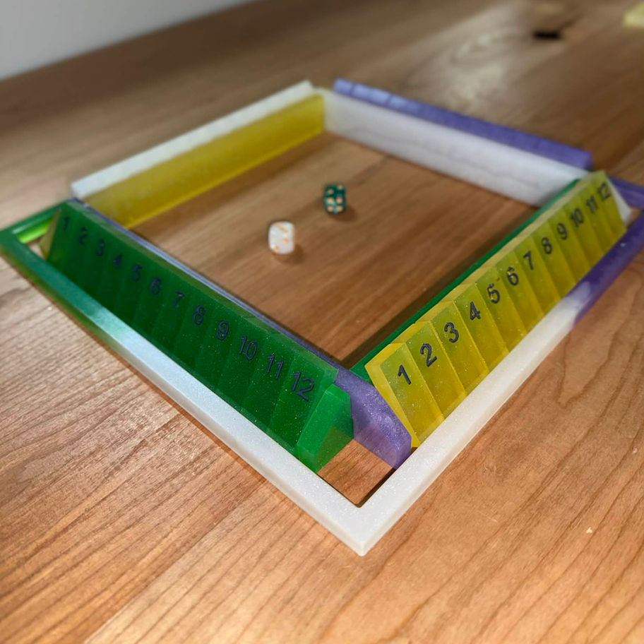 Découvrez Ferme la boîte, un jeu de société classique revisité en version artisanale et époxy coloré.