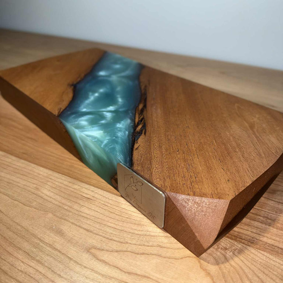 Ajoutez une touche dâĂ©lĂ©gance Ă votre dĂ©cor avec cette piĂšce unique alliant bois exotique et rĂ©sine Ă©poxy turquoise nacrĂ©e.