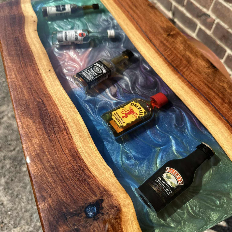 Planche en bois et époxy avec mini bouteilles d’alcool