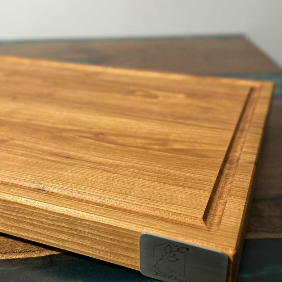 Fabriquée à la main avec soin dans notre atelier, cette planche à découper en bois de cerisier massif allie élégance naturelle et durabilité exceptionnelle. Son grain chaud et sa teinte rosée évoluent avec le temps pour offrir un charme unique à votre cuisine.