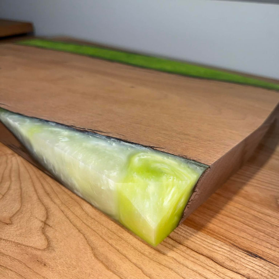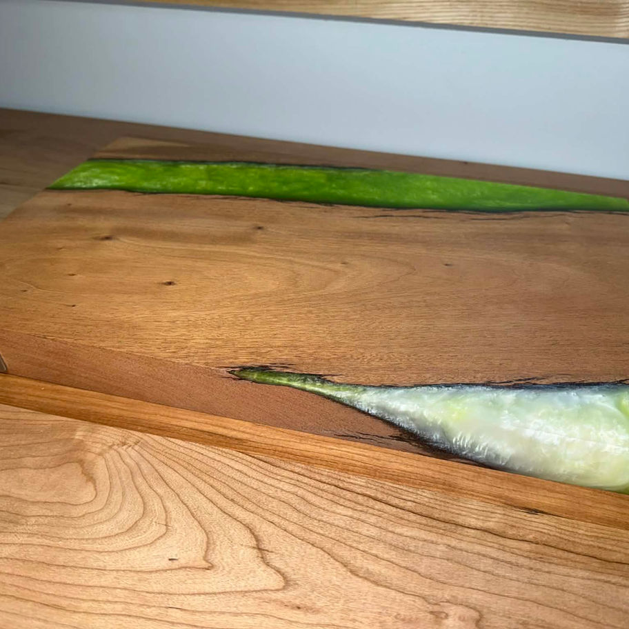 Ce plateau artisanal marie la beautĂ© naturelle du bois massif Ă lâĂ©clat moderne dâune rĂ©sine Ă©poxy verte . Chaque piĂšce est fabriquĂ©e Ă la main dans notre atelier de Granby, oĂč le souci du dĂ©tail et la qualitĂ© de finition sont prioritaires.